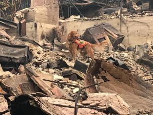 About 15 years ago I was sitting in my vet’s waiting room in Livermore, CA with our first Golden Retriever, Bailey. Hanging on the wall was a print of a Firefighter with his arms around a Golden Retriever. The picture captivated me in a deeply emotional way. The firefighter is sitting on the ground, eyes closed looking exhausted and traumatized. He wears knee pads, leather gloves, and a helmet with a mounted flashlight. He is positioned in a way that he can cradle his partner, a Golden Retriever, between his legs. The Golden is wearing an orange vest with an American Flag and the word “Rescue” inside a white cross. With tired eyes the dog looks equally exhausted and sad as his handler.